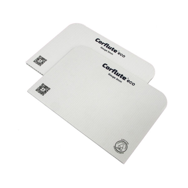 Corflute® eco is made from a combination of 50% consumer and post-industrial waste together with virgin polypropylene, resulting in a premium graphic grade material. This sheet usually has an off-white / light grey look with a very subtle speckle due to its recycled content.