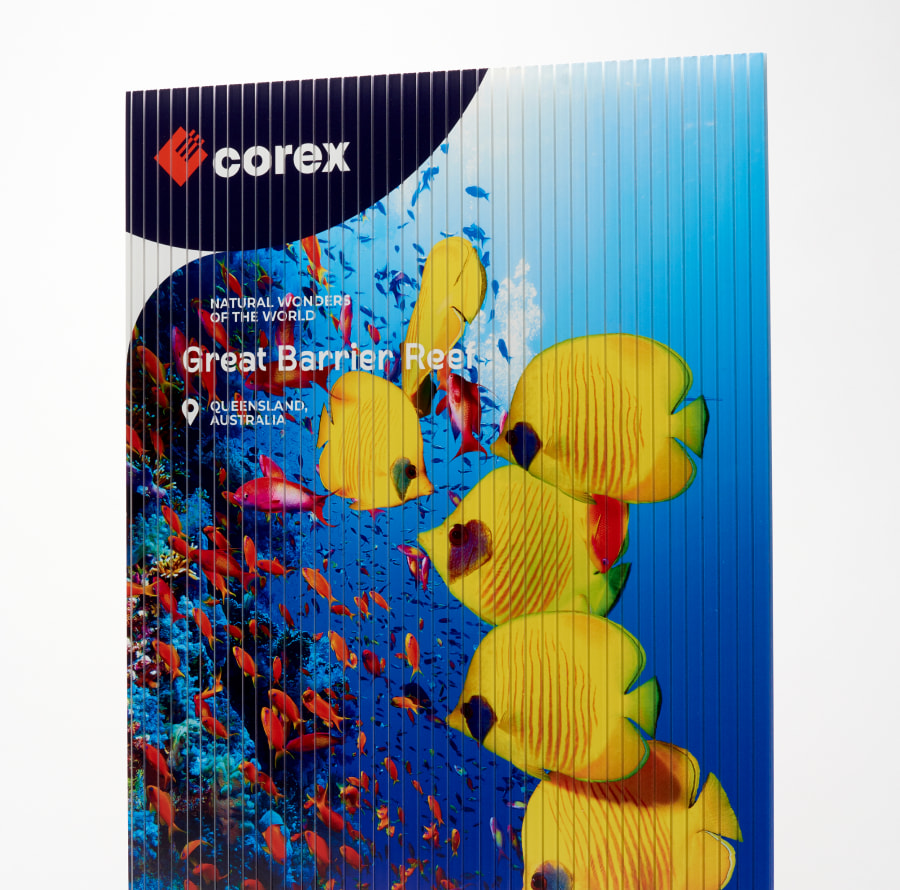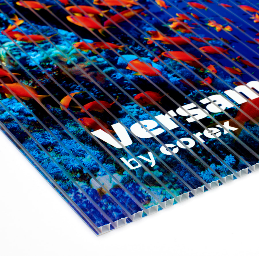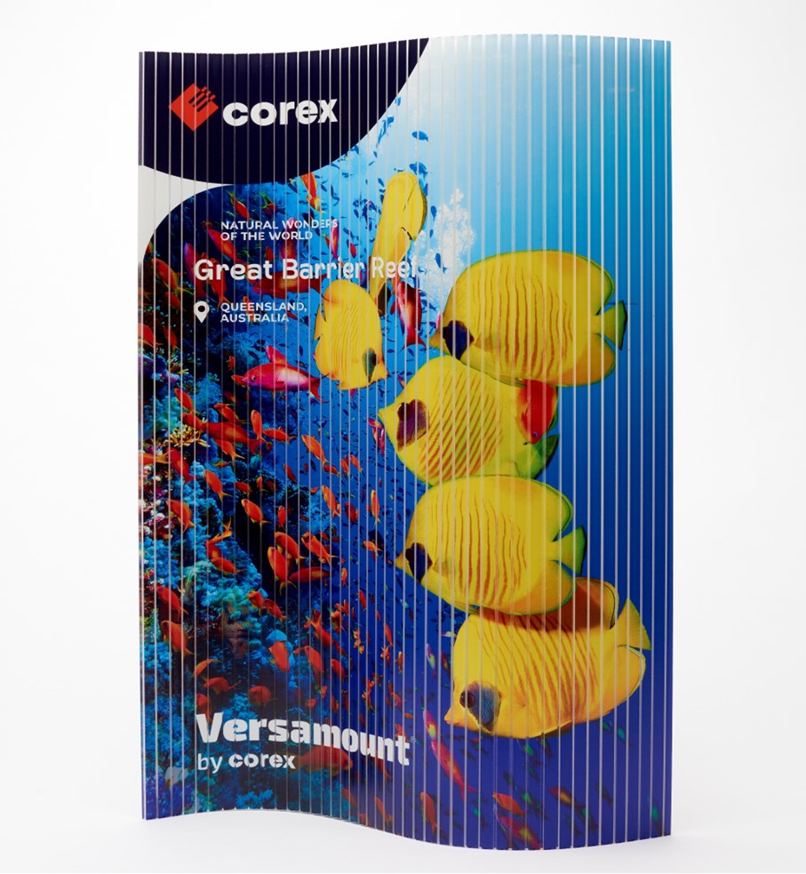Versamount® has the strength and rigidity of Corflute® but designed to be curved. Versamount has a routed profile allowing for bilateral flexibility which enables sheet to be contoured to achieve flowing curves and cylindrical forms.